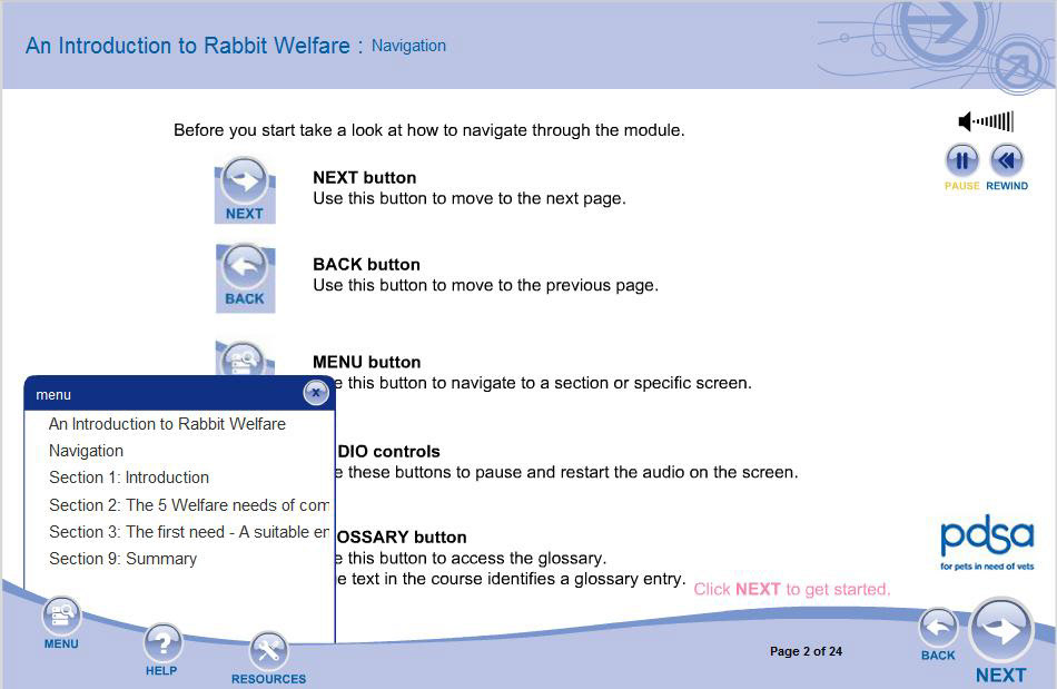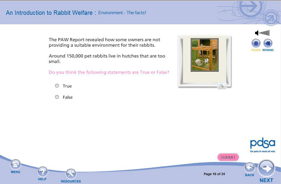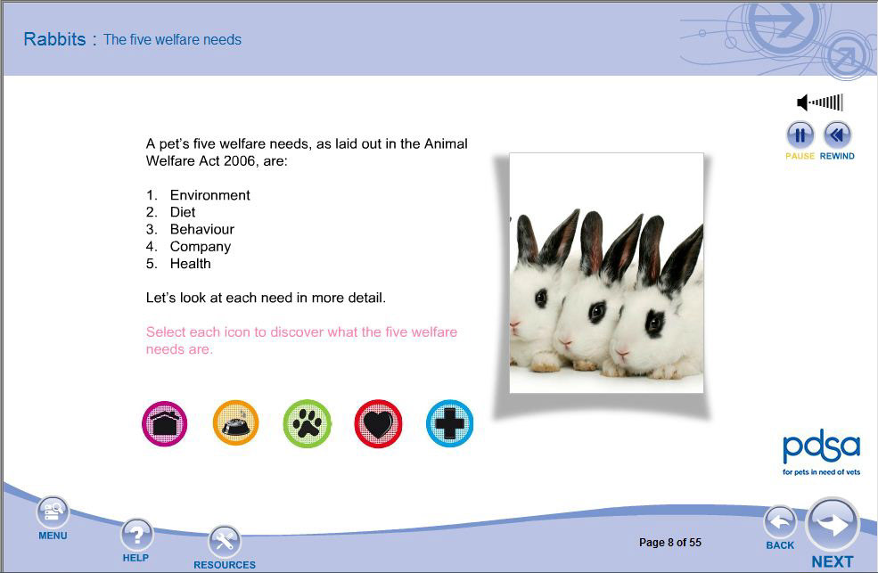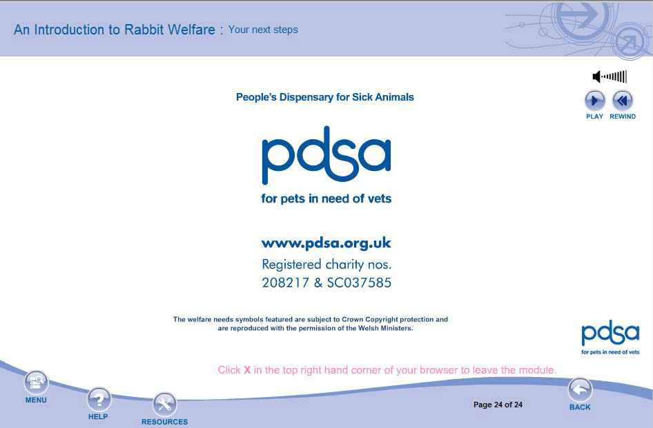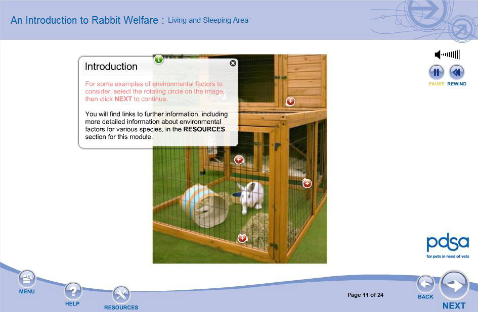 The first in a series of animal welfare e-learning modules created using Articulate Studio 09 and PowerPoint.