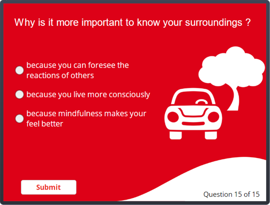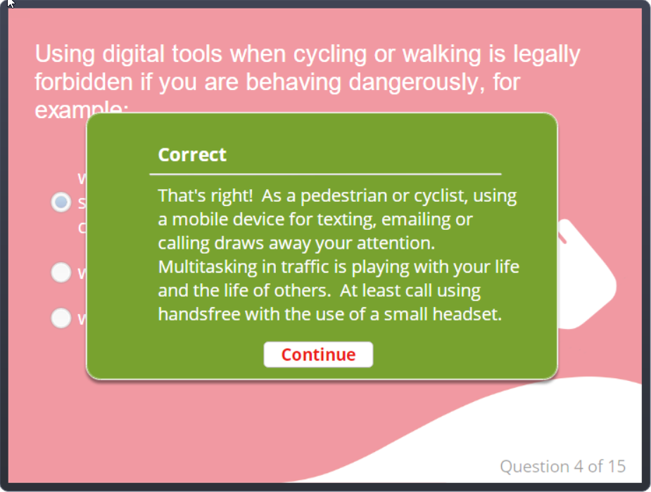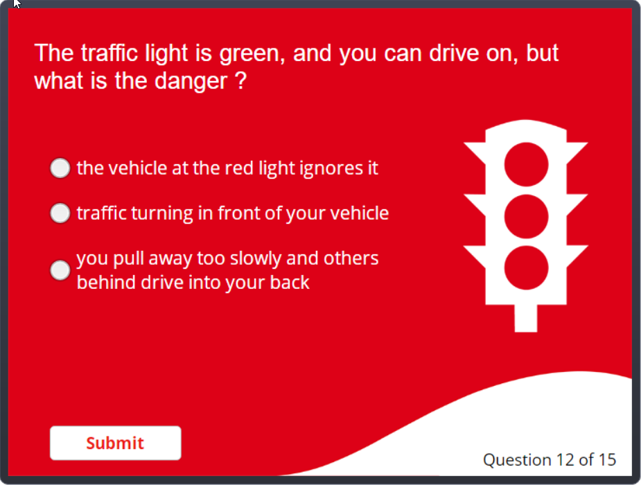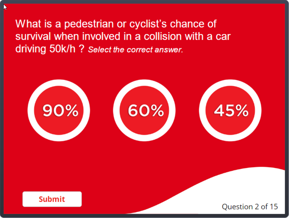 A short quiz to raise awareness of some common traffic risks based on company analytics. Created using Articulate Storyline.